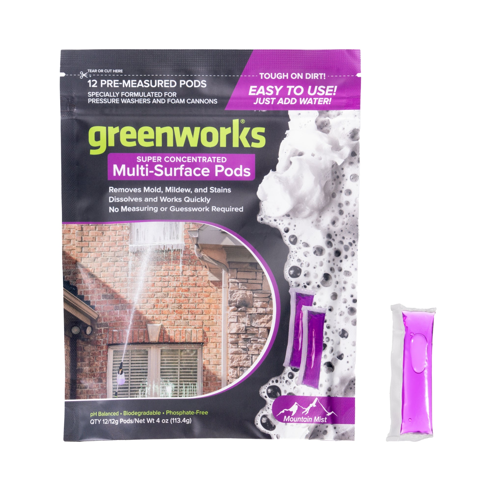 Simplify your cleaning routine with the Greenworks super-concentrated multi-surface wash pods—pre-measured and made for real cleaning power. Each foam soap pod delivers a powerful cleaning punch with high-lubricity foam that lifts mold, mildew and stains. Just add water—no measuring, no waste. This pH balanced cleaning soap is safe for all exterior surfaces and coatings, making it the ideal solution for traditional bucket washes, traditional soap tank on pressure washer or with foam cannon and foaming sprayer. One pod creates gallons of rich, foaming wash soap that rinses clean and leaves behind a glossy, streak-free shine. Compatible with pressure washer car soap systems, this advanced multi-cleaning soap dissolves quickly and completely in all temperature water. Utilizing warm water in a foaming tool will accelerate pod film dissolution. Pods are not safe for consumption.