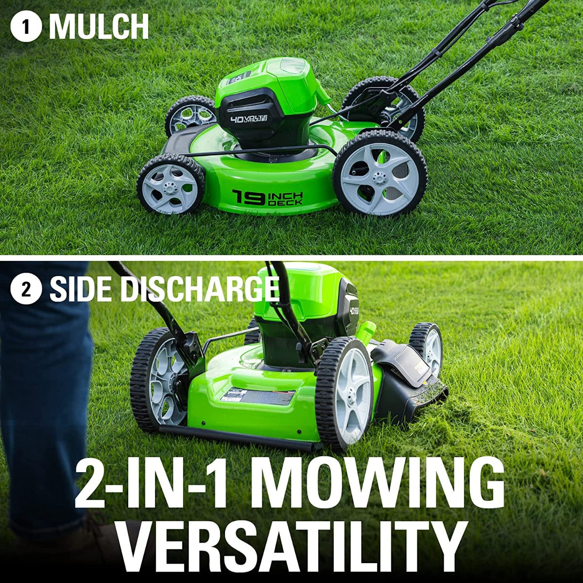 • 2-in-1 System: Mulch, Side Discharge