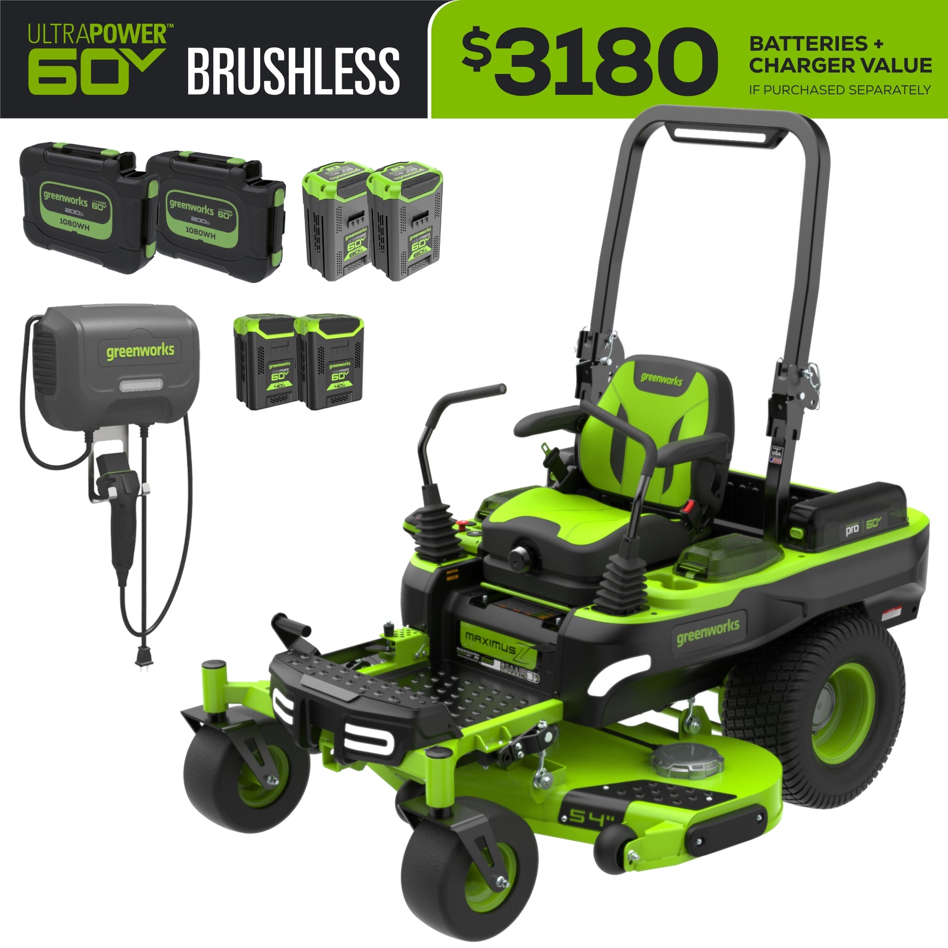Compatible with the 60V 54" MaximusZ Zero Turn Riding Mower with (2) 20.0 Ah, (2) 8.0 Ah & (2) 4.0 Ah Batteries and 1.5kW Charger