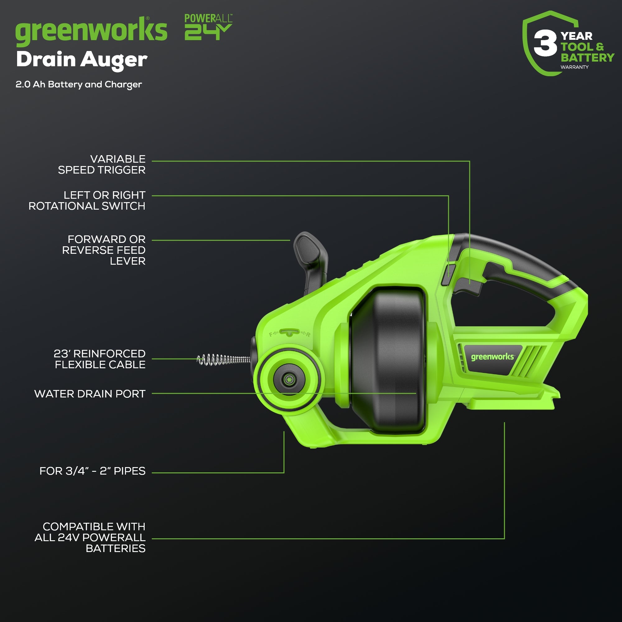 24V 23-FT Cordless Battery Drain Auger