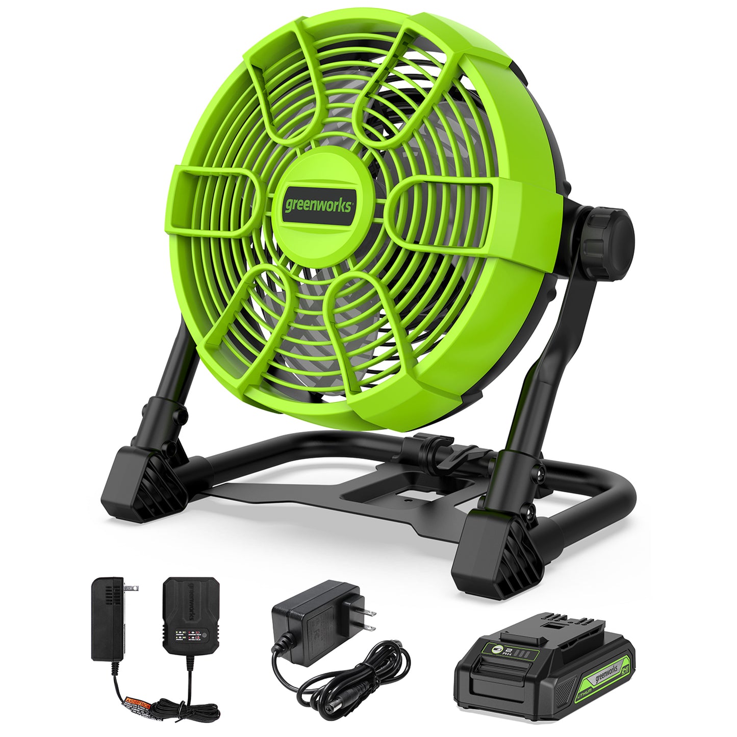 24V Cordless Fan w/ 2.0Ah USB Battery, 0.5A Charger & AC Adapter 24V Cordless Fan w/ 2.0Ah USB Battery, 0.5A Charger & AC Adapter