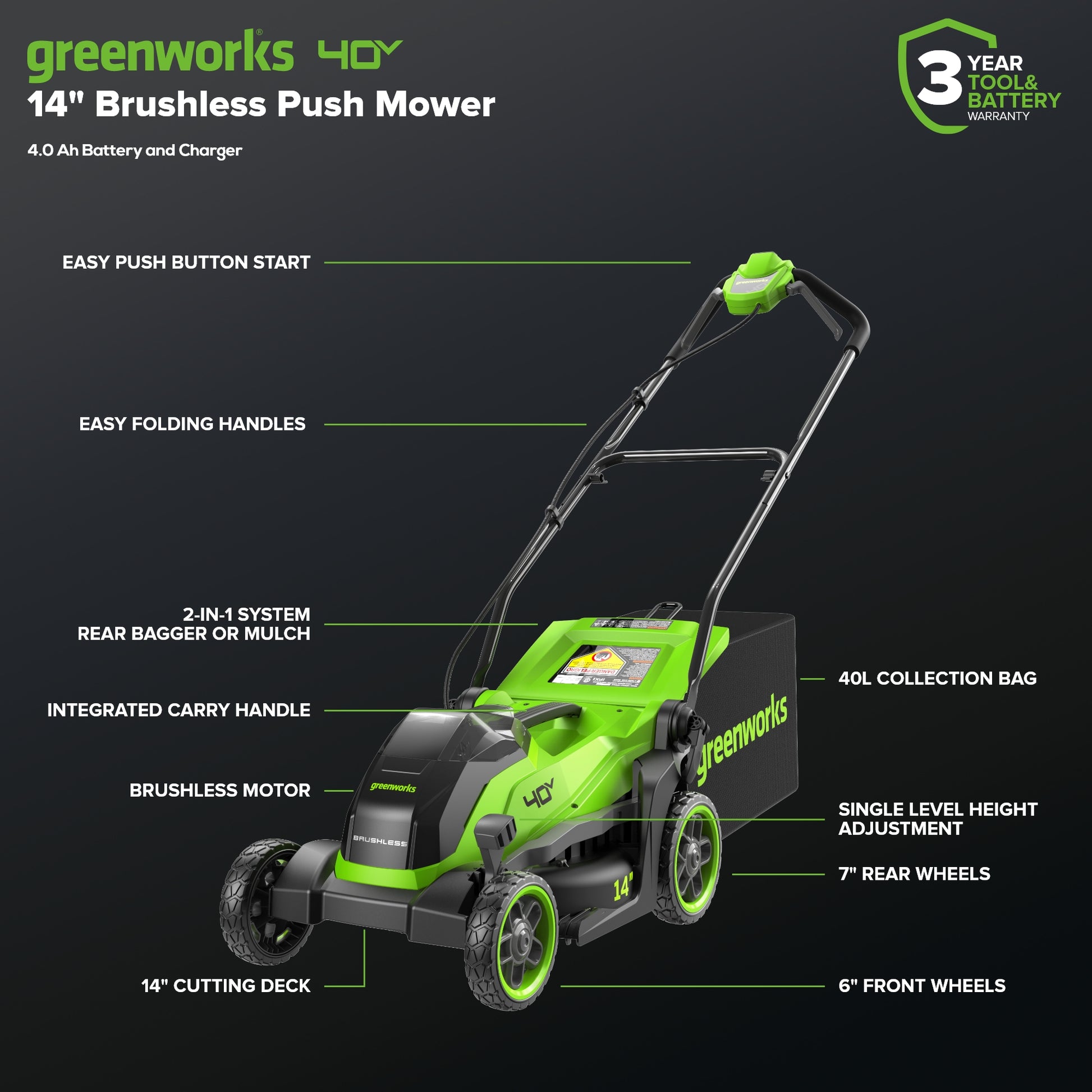 40V 14" Cordless Battery BL Push Lawn Mower w/ 4.0Ah Battery & Charger
