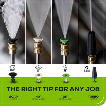 Turbo Nozzle -This nozzle rotates in a zero-to-15-degree spray pattern in a circular motion to break down tough dirt and grime. The spray pattern can cover an area of 4 to 8 inches wide depending on the distance between the tip and the surface being cleaned.