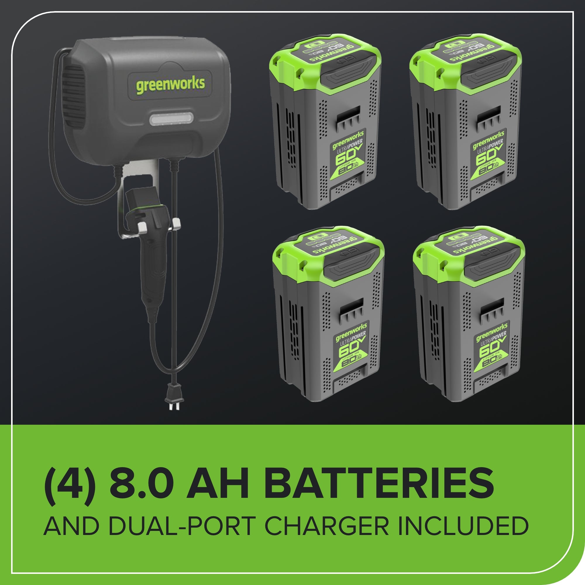 • What's Included: (4) 8.0Ah Batteries and (1) 0.6kw Turbo Wall Charger