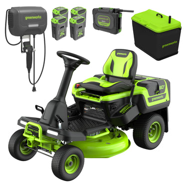 The Greenworks 30" Tractor is equipped with a powerful combination of (4) 8.0Ah + (1) 20.0Ah batteries, delivering enough power to mow up to 2.3 acres on a single charge. The included wall-mounted charger ensures quick and hassle-free recharging, so you can tackle large lawns with ease and efficiency.