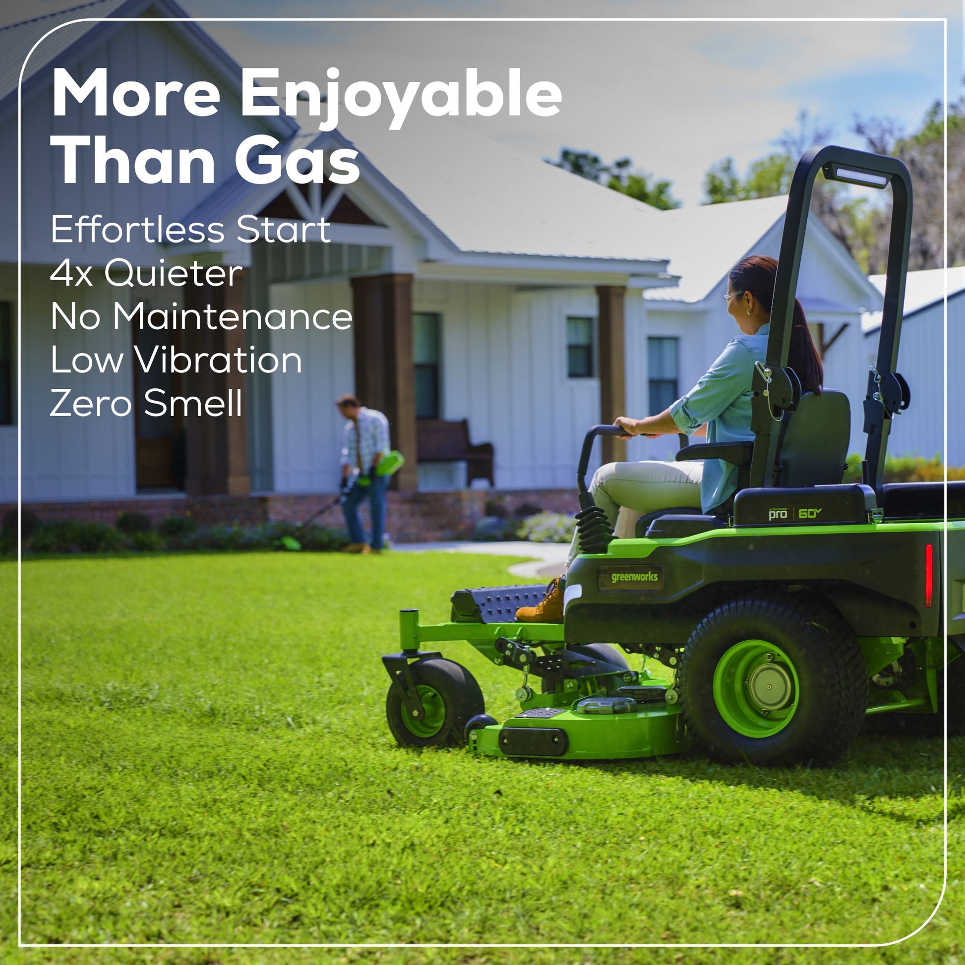 The ease of use depends on the operator’s experience. Unlike traditional steering wheels, Zero-Turn mowers use independent motors and handlebars, requiring some practice. New users may find it beneficial to watch instructional videos on our official Greenworks YouTube Channel for guidance.