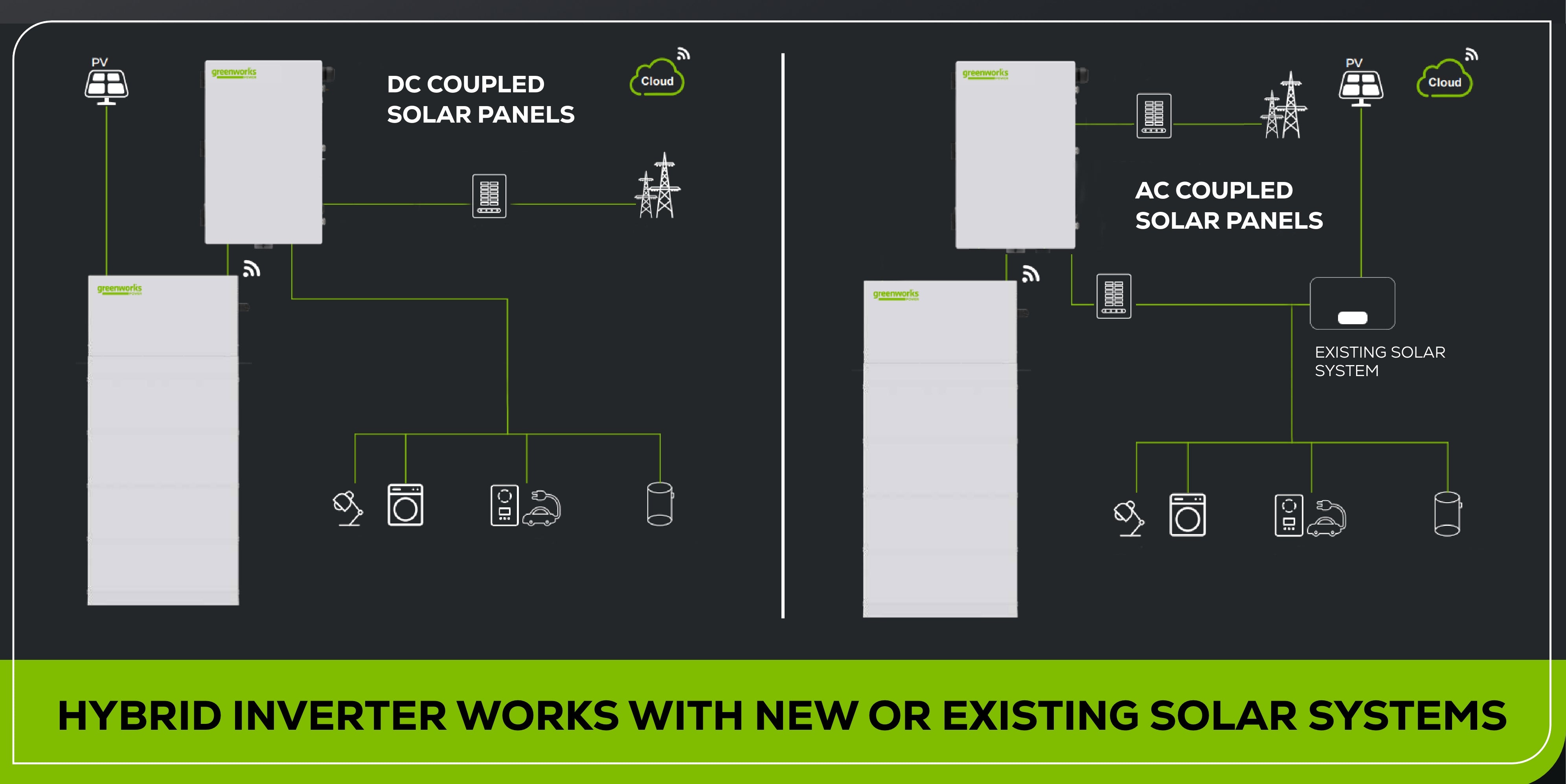 At the center of any solar system is the Inverter, converting the energy from the solar panels to the power used in your home. The Greenworks 7.6kW Hybrid Inverter stands alone with its exceptional build quality and flexibility in design. Homeowners and Installers will both appreciate its simple integration with the Greenworks PowerHub Energy Storage system, so you can start with solar only and easily add on battery storage later.