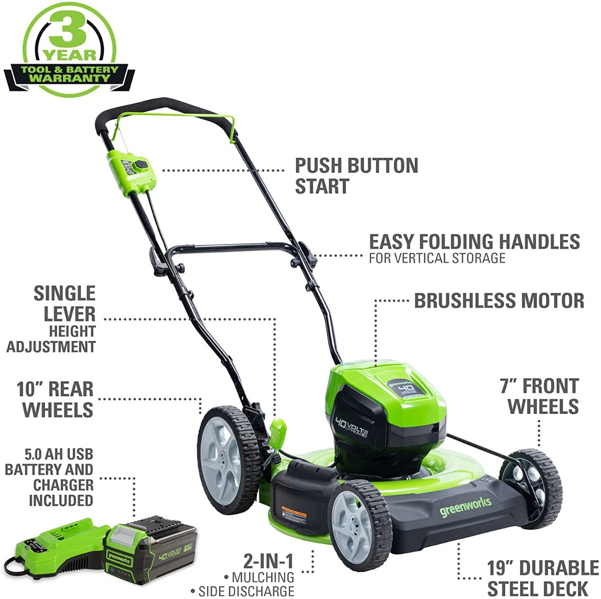 • What's Included: One (1) 40V 5.0Ah Battery and 2A Charger Included