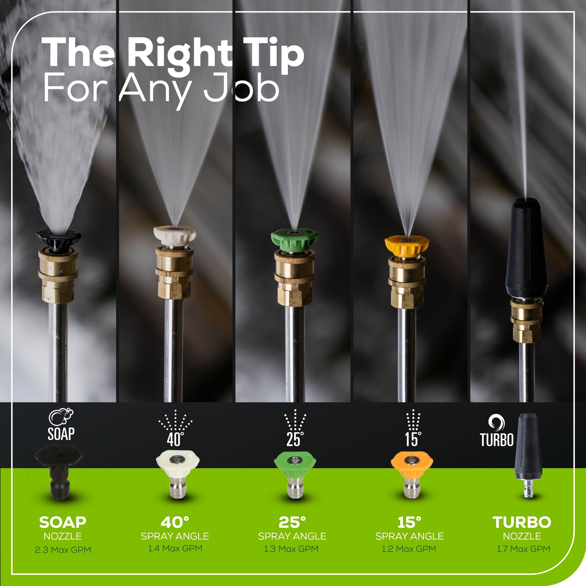 Turbo Nozzle -This nozzle rotates in a zero-to-15-degree spray pattern in a circular motion to break down tough dirt and grime. The spray pattern can cover an area of 4 to 8 inches wide depending on the distance between the tip and the surface being cleaned.