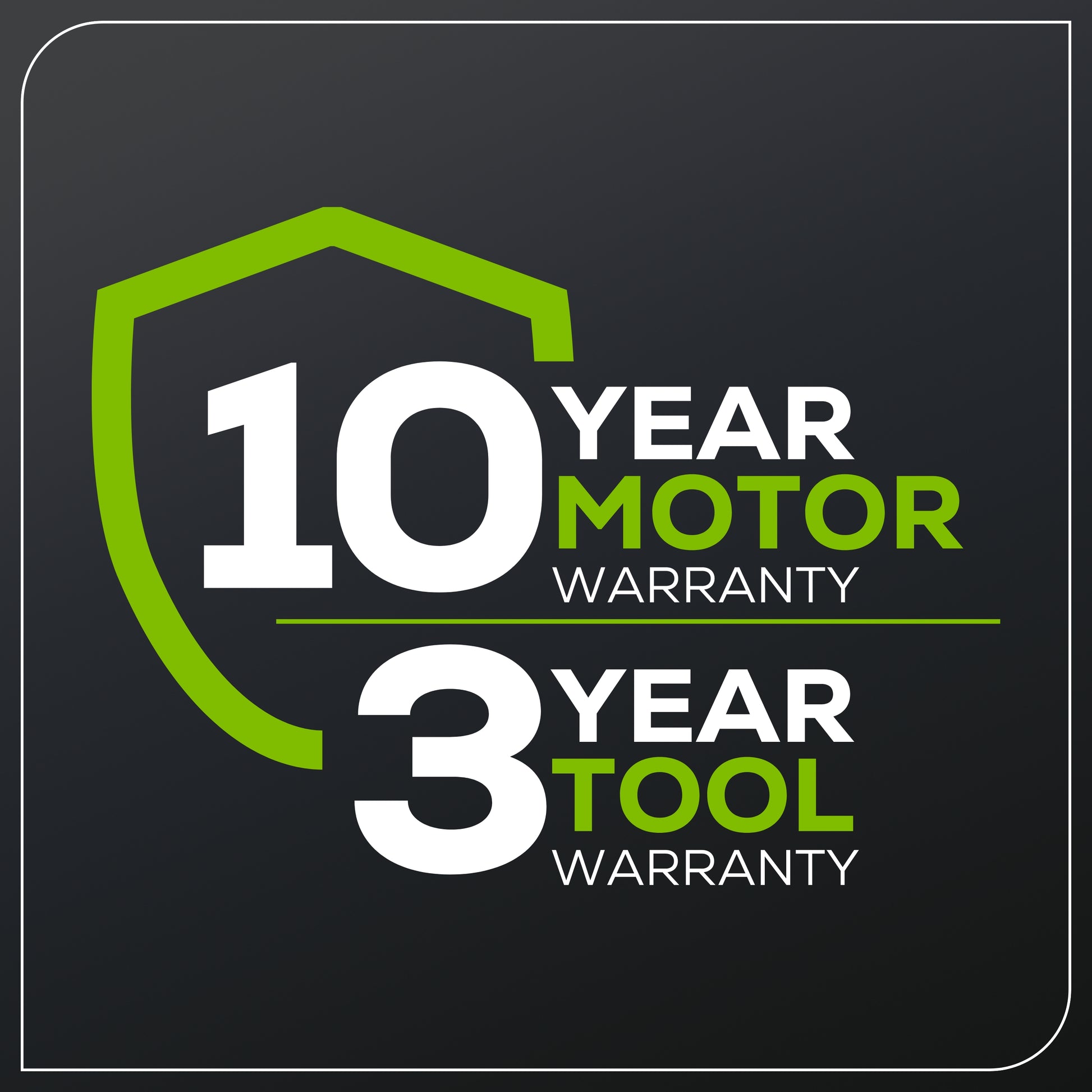 <h3>3-Year Tool Warranty</h3><h3>10 Year Brushless Motor Warranty</h3><p>Find peace of mind with Greenworks Limited Warranty.</p>