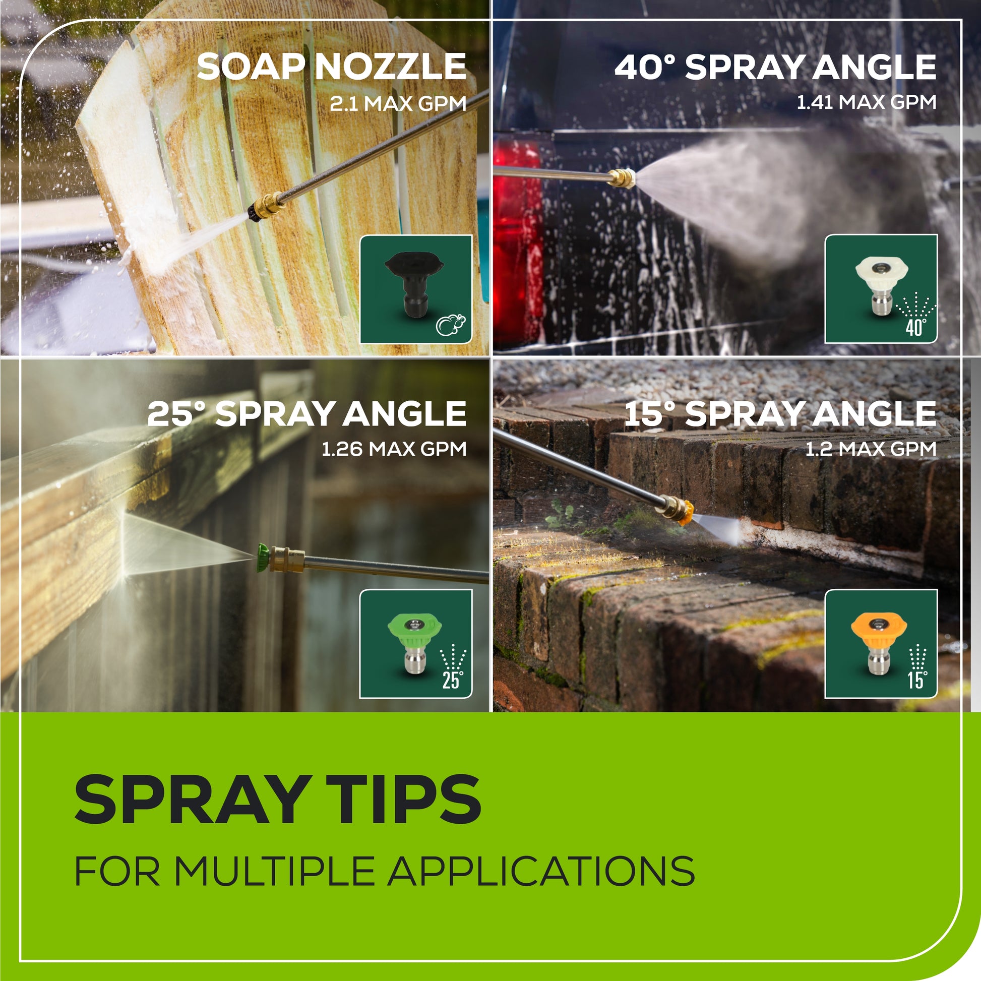 • Equipped with rugged metal gun and hassle-free 25-ft steel braided rubber hose; 15°, 25° and 40° tips, plus soap and turbo nozzles included