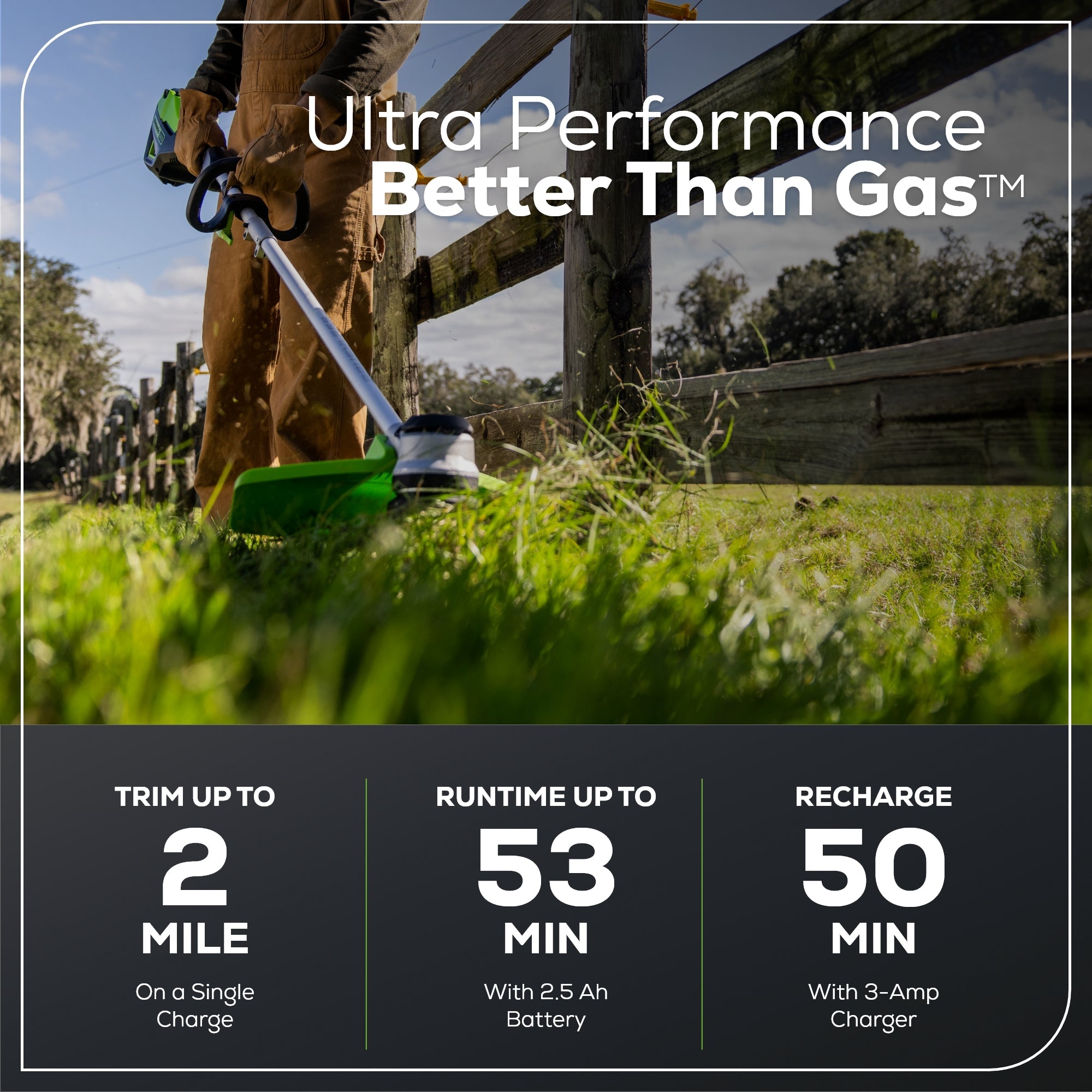 The powerful Greenworks Pro 60V UltraPower™cordless battery platform gives you all the power you need to tackle all your lawn care projects. Kick gas to the curb this spring and go green with no fumes, no mixing, no maintenance and no pull cords. Let Greenworks help you take the work out of yard work.